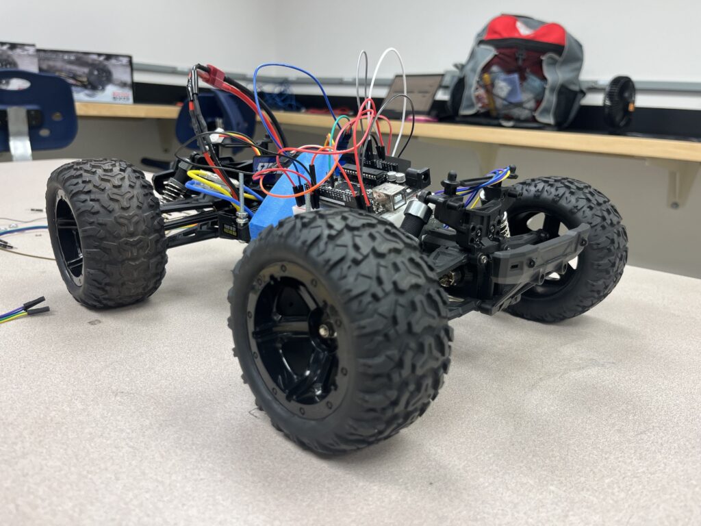 Developed a prototype of the racecar to test how the drive and steering motors responded to commands. To give us an idea of how the car would keep a safe distance from wall, we implemented an ultrasonic sensor to the side of the car and programmed the controller to gradually turn the car away from the wall if it got too close.