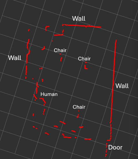 Got the Raspberry Pi to transmit LiDAR data of our lab room wirelessly to the laptop. We positioned the LiDAR in the middle of the room and were able to see not just the outline of the room, but also ourselves as we walked around within it.