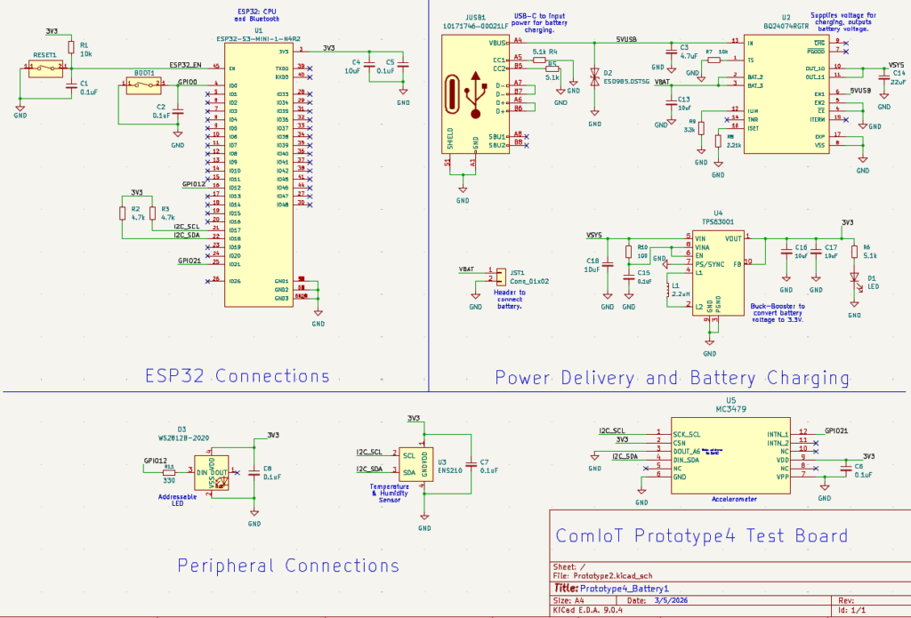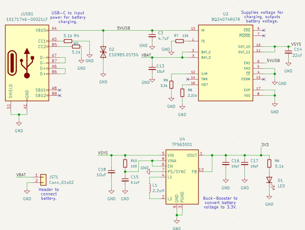 Updated Power Delivery with Battery Charging: The PCB now communicates entirely with the app via Bluetooth, providing seamless wireless control. Charging is handled by simply plugging a USB-C cable into the board, which charges the Li-Po battery connected through the JST1. This battery not only stores power but also drives the board through the BQ24074 integrated circuit, which manages charging and power flow. From there, the power is regulated by the TPS63001 3.3V buck-boost converter, supplying a stable 3.3V to the entire PCB for reliable operation.