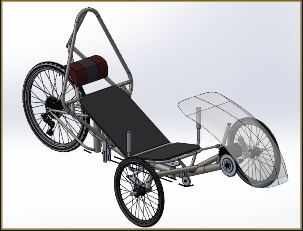 The team is designing and fabricating a tadpole-style recumbent tricycle. The vehicle will be human-powered by the pedals with an electric motor assist.