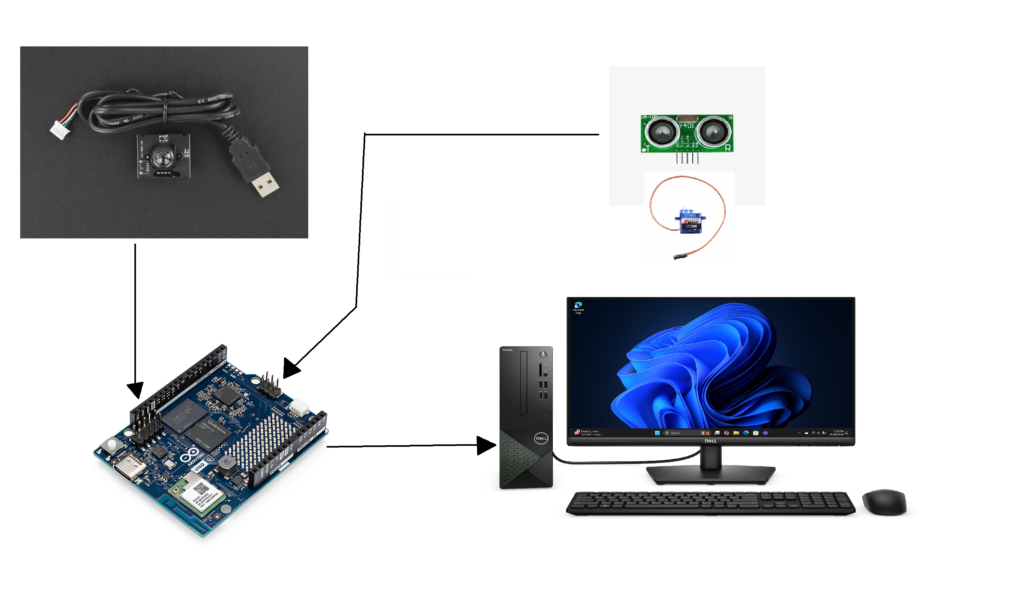 Our plan is to Mount the camera to the top of a monitor in front of the user while an ultrasonic sensor is setup on a servo on the desk near their hand. These two will be wired into the UNO Q and said board will, in turn, control the computer input.