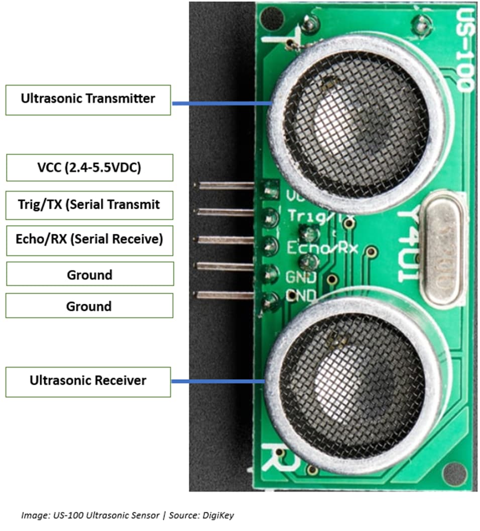 The sensors we’ll be using are the US-100 Ultrasonic Distance Sensor. This is slightly different than the standard one, the HC-SR04, one might see used for this application or with Arduinos and raspberry pi boards like we are using. This is because the US-100 sensors have an extra pin and toggleable functionality which allows us to use them in serial or manual(trigger) modes. The difference here is that the serial mode preforms all the calculations for distance on the sensor itself which frees up more space on the microcontroller. This means that we have more processing power on the microcontroller to interpret the data and decide which hand signal is shown. But this also allows us to change the functionality back to manual mode when needed.