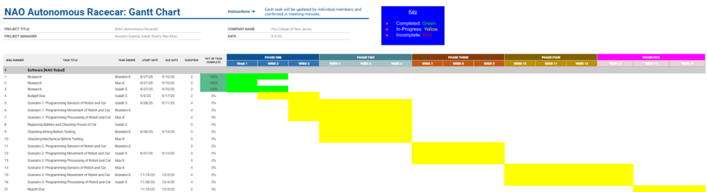 • SUMMARY: We reviewed the Gantt Chart and our roles as team members. Brandon was assigned the task of building the website, and Isaiah was assigned the task of keeping the Meeting Minutes Notebook updated during Technical Advising Meetings.